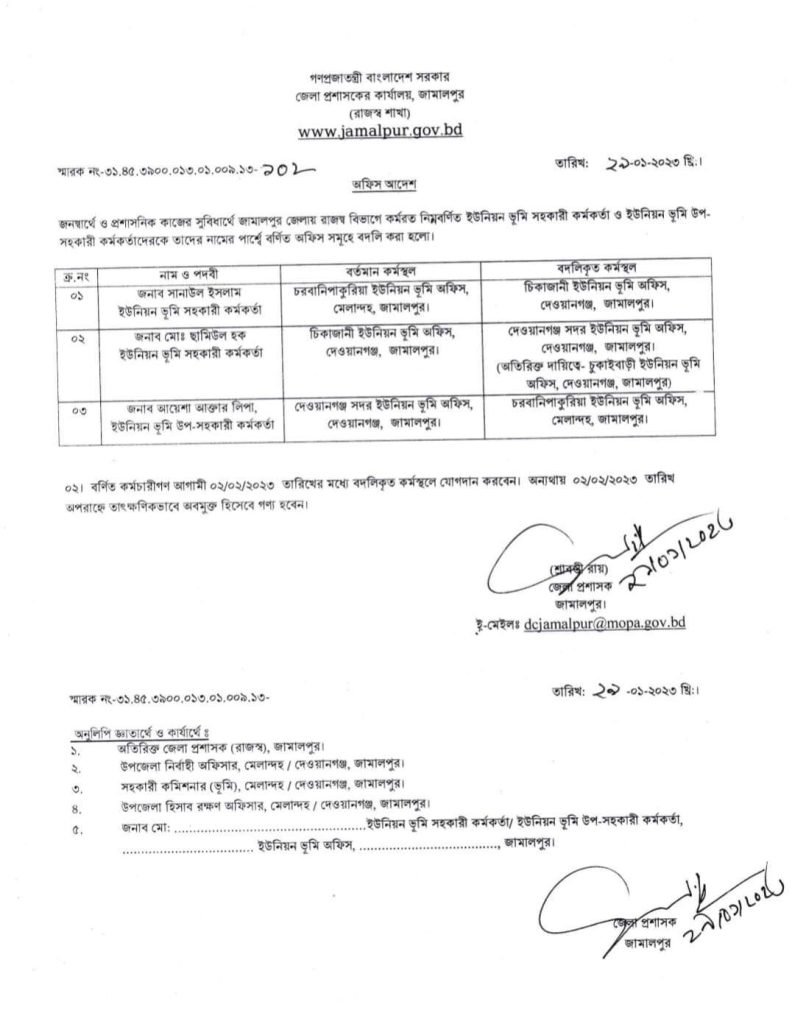 জামালপুরের জেলা প্রশাসক শ্রাবস্তী রায় স্বাক্ষরিত ওই আদেশে বলা হয়, জনস্বার্থে ও প্রশাসনিক কাজের সুবিধার্থে জামালপুর জেলার রাজস্ব বিভাগে কর্মরত নিম্নবর্ণিত ইউনিয়ন ভূমি সহকারী কর্মকর্তা ও ইউনিয়ন ভূমি উপ-সহকারী কর্মকর্তাদেরকে তাঁদের নামের পার্শ্বে বর্ণিত অফিস সমূহে বদলি করা হলো। বর্ণিত কর্মচারীগণ আগামী ২ ফেব্রুয়ারি তারিখের মধ্যে বদলিকৃত কর্মস্থলে যোগদান করবেন। অন্যথায় ২ ফেব্রুয়ারি তারিখ অপরাহ্নে তাৎক্ষণিক ভাবে অবমুক্ত হিসেবে গণ্য হবেন।