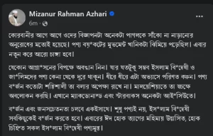পোস্টের কমেন্ট বক্সে তিনি পুনঃশ্চ লিখেন, ‘শুধু পণ্যই নয়, ইসলাম বিদ্বেষী সবকিছুকেই বর্জন করতে হবে। এবারের ঈদ হোক ত্যাগের মহিমায় উদ্ভাসিত, হোক চিহ্নিত সকল ইসলাম বিদ্বেষী পণ্যমুক্ত।’