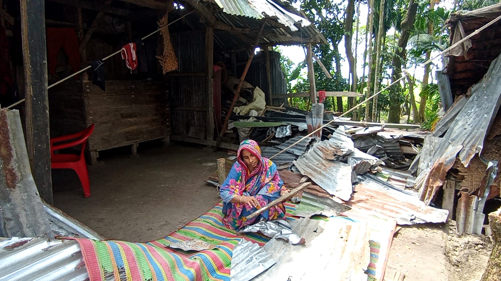 রহিমা বেগম জানান, তার স্বামী জামাল প্রায় ৪ বছর ধরে ক্যান্সারে আক্রান্ত ছিল এবং গত ৩ মাস আগে সে মারা যায়। নিজেদের কোনো জায়গা সম্পত্তি না থাকায় বেড়িবাঁধের উপর সরকারি খাস জমিতে বসবাস করে আছিলো। কিন্তু গত শুক্রবার রাতে হঠাৎ করে ঝড় শুরু হয়। এসময় বেড়িবাঁধে লাগানো বিশাল আকৃতির একটি চাম্বুল গাছ তার ঘরের উপর আচড়ে পড়ে। তখন সে ও ঘরের মধ্যে আটকা পড়ে। তার চিৎকার শুনে প্রতিবেশিরা এসে তাকে উদ্ধার করে। পরিবাররে উপার্যনক্ষম কেউ না থাকায় তার পক্ষে ঘর মেরামত করা সম্ভব নয়। অসহায় রহিমা বেগমের ঘরটি মেরামতে সহযোগীতা করার দাবী জানিয়েছেন স্থানীয়রা।